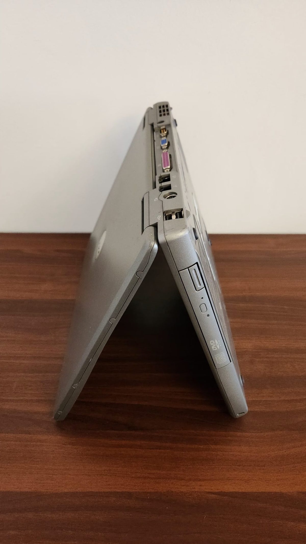 The Dell Latitude D505 was built with a classic business aesthetic — no-frills design, wide keyboard layout, and a solid grey chassis. The laptop is moderately portable and features enough I/O ports for legacy devices and peripheral connections.