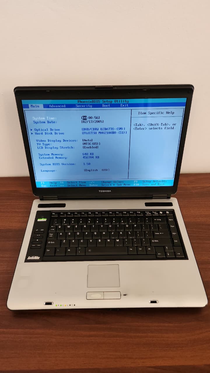 This laptop features a 15.4-inch LCD display providing sufficient screen space for everyday computing. While the resolution and brightness are modest compared to modern laptops, it remains practical for document editing, browsing offline content, or running lightweight applications. The display is compact enough for portability yet large enough to maintain a comfortable viewing experience.